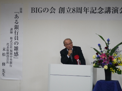 BIGの会創立8周年の記念講演は、株式会社福岡中央銀行 代表取締役会長 末松 修 様をお招きし、『ある銀行員の雑感』と題し、講演を行っていただきました。