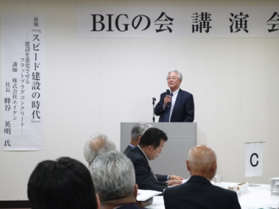2015年11月12日(木)西鉄イン福岡2階Aホールにて、BIGの会 11月度例会が開催されました。 11月度例会では、株式会社エイケン 蜂谷英明社長に、「スピード建設の時代 〜建設を進化させるフラットプラグコンクリート〜」と題し、講演を行っていただきました。